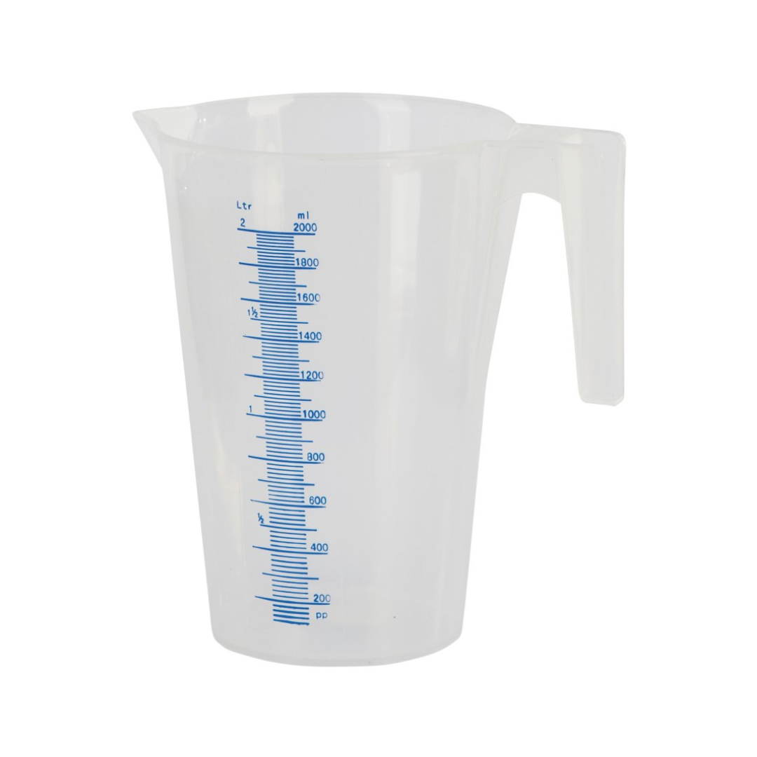 Plastmasas mērglāze ar skalu, 2 l tilpums. Precīza, izturīga un ērta šķidrumu dozēšanai saimniecībā, virtuvē vai rūpniecībā.