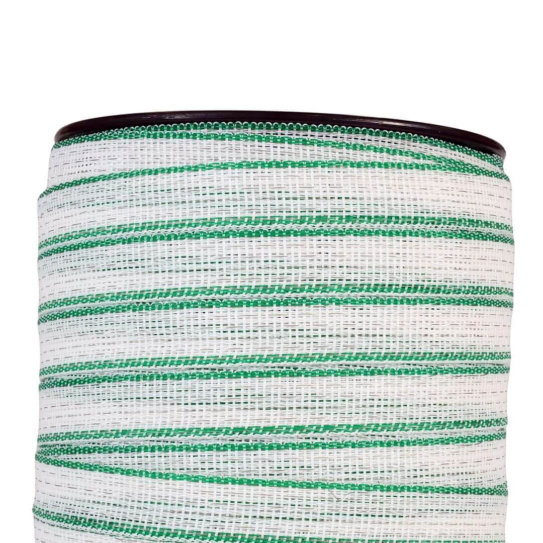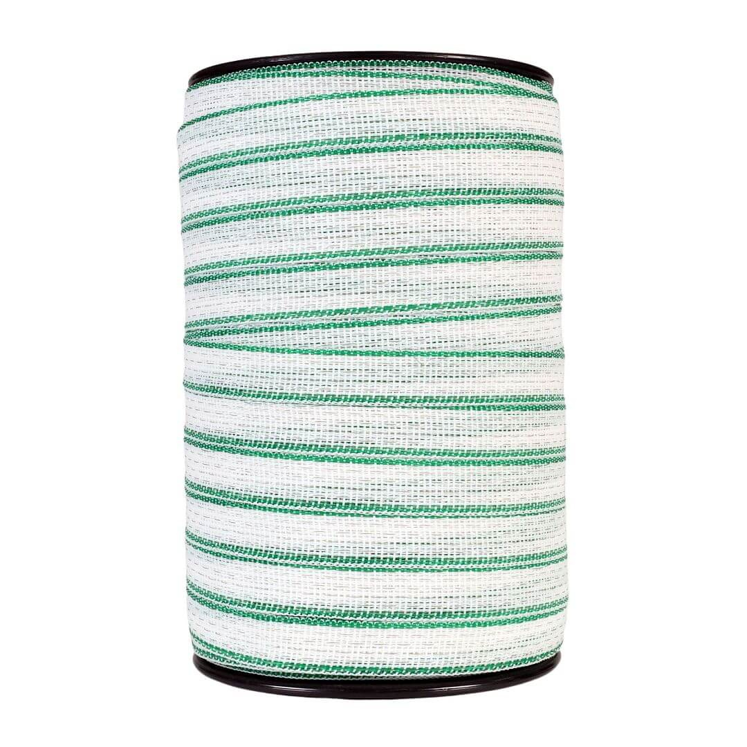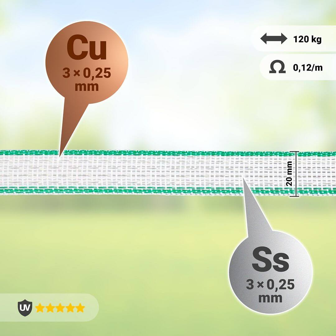 Elektriskā gana lenta ar UV aizsardzību un ar nerūsējošā tērauda stieplēm. Universāla pielietojuma regulāriem un garākiem elektriskajiem žogiem.