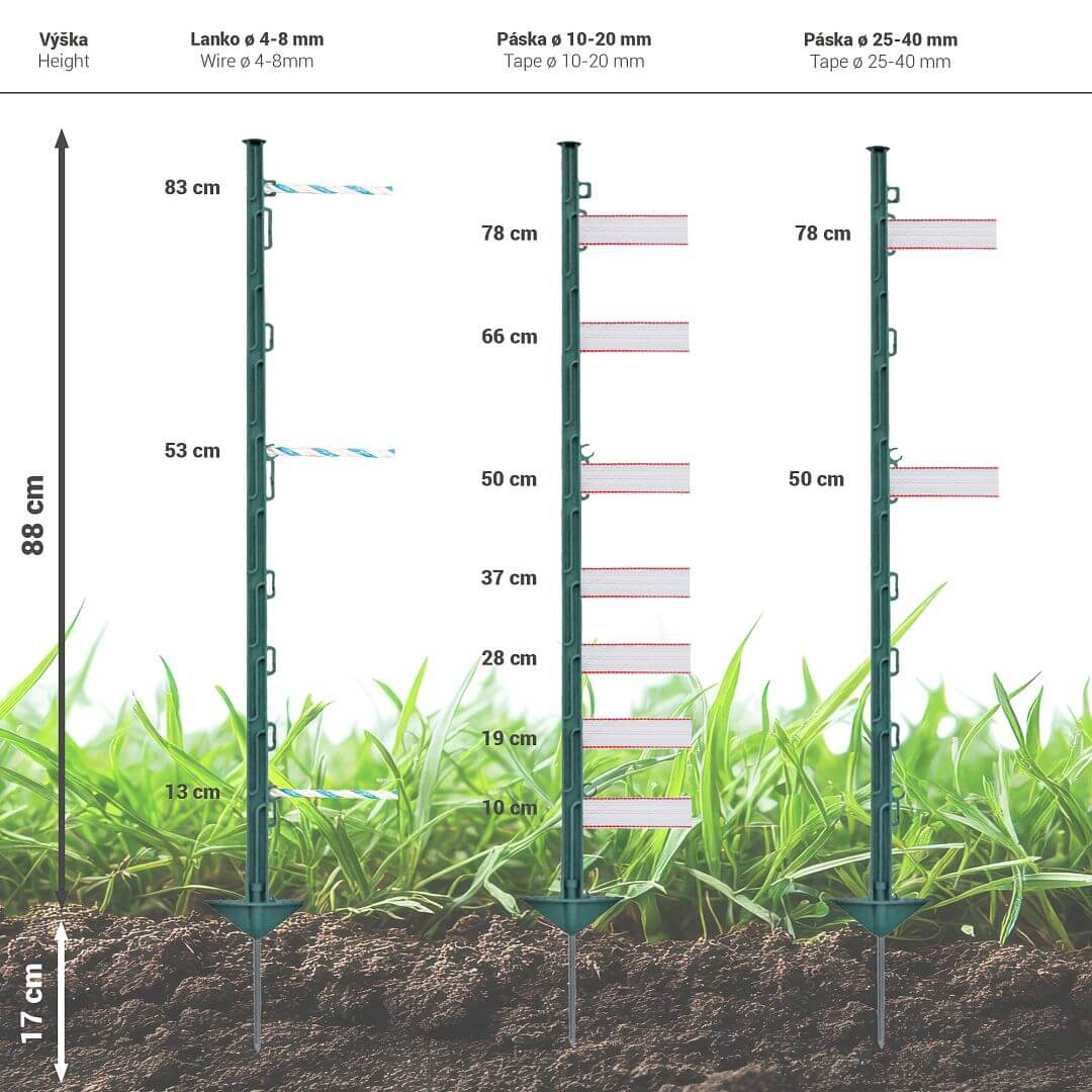 Ieteicams stabu izvietot attālumā 3 – 7 metri viens no otra, atkarībā no virves / lentes veida un reljefa.