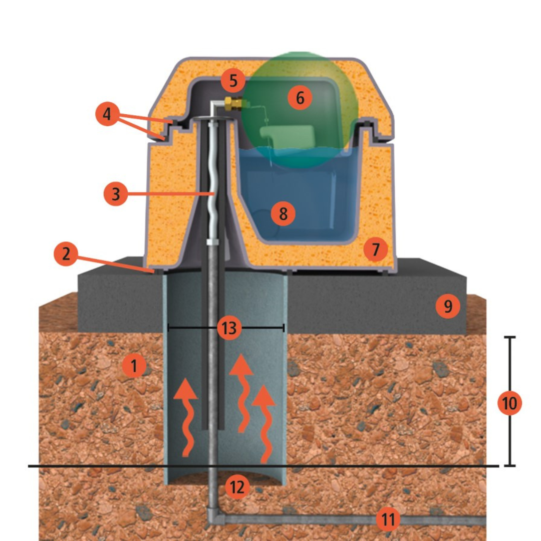 1. Caurules siltumizolācija 2. Izolējoša blīve starp konstrukciju un pamatni 3. Pīta nerūsējošā tērauda šļūtene 4. Dubultā blīvēšanas sistēma 5. Pludiņa tipa vārsts 6. Sfērisks elements (lode) 7. Siltumizolācijas putu slānis 8. Ātrās noteces aizbāznis 9. Betona pamatne 10. Augsnes sasalšanas dziļums: 0,8–2,0 m 11. Ūdens pievada pieslēgums 1/2″ 12. Tieša saskare ar grunti, kas nodrošina dabiskā siltuma pieplūdi 13. Caurule ar minimālo iekšējo diametru 30 cm |